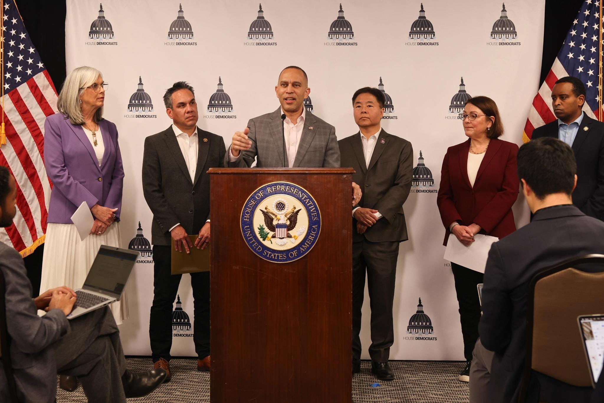 House Minority Leader Hakeem Jeffries (D-N.Y.), House Minority Whip Katherine Clark (D-Mass.), House Democratic Caucus Chair Pete Aguilar (D-Calif.), House Democratic Caucus Vice Chair Ted Lieu (D-Calif.), House Assistant Minority Leader Joe Neguse (D-Colo.) and Democratic Congressional Campaign Committee Chair Suzan DelBene (D-Wash.) speak at a press c…