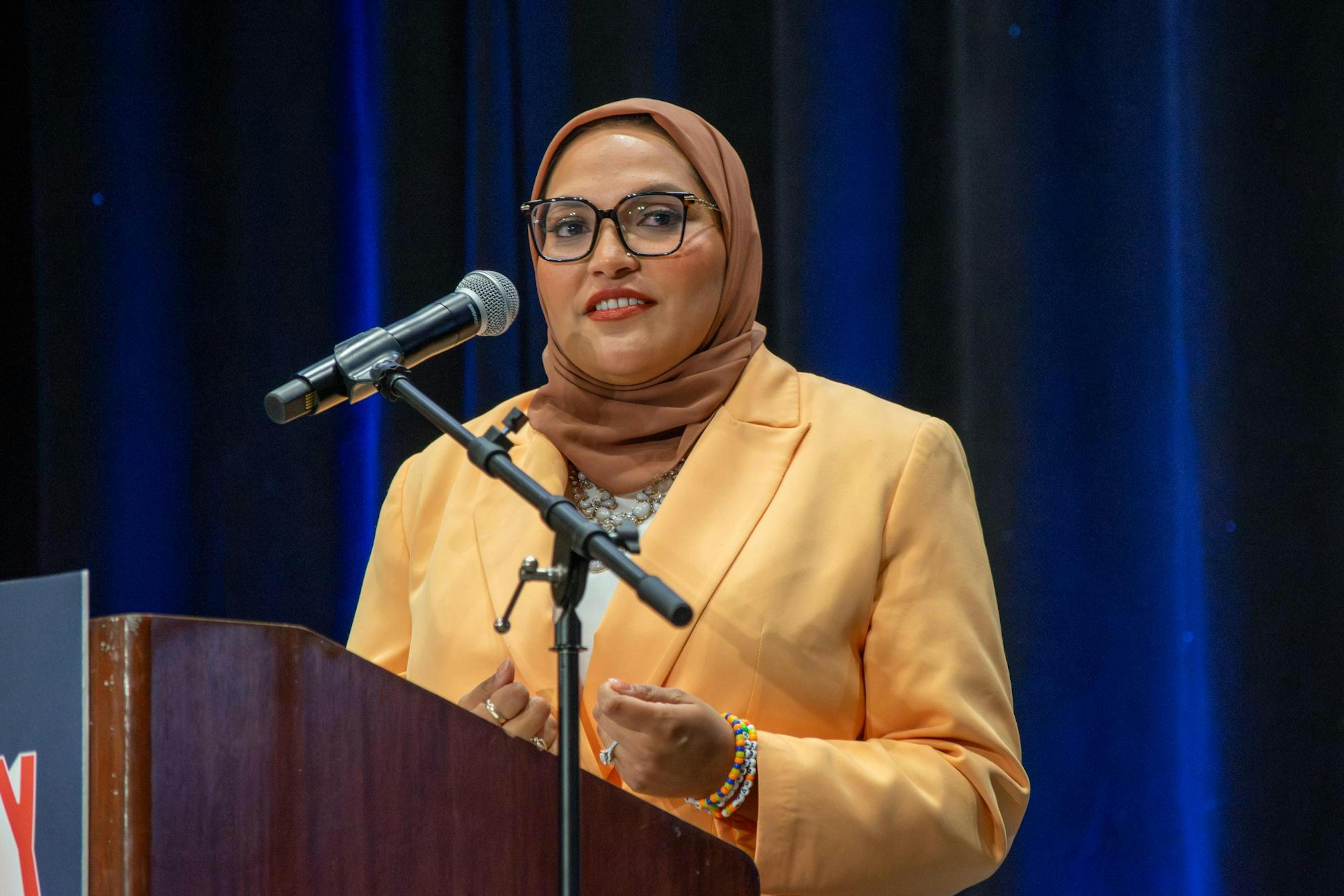 Durham County Commissioner Nida Allam speaks during a Fighting Oligarchy event at the Durham Convention Center on Friday, Feb. 13, 2026. Photo by Ava Sharon/The Daily Tar Heel