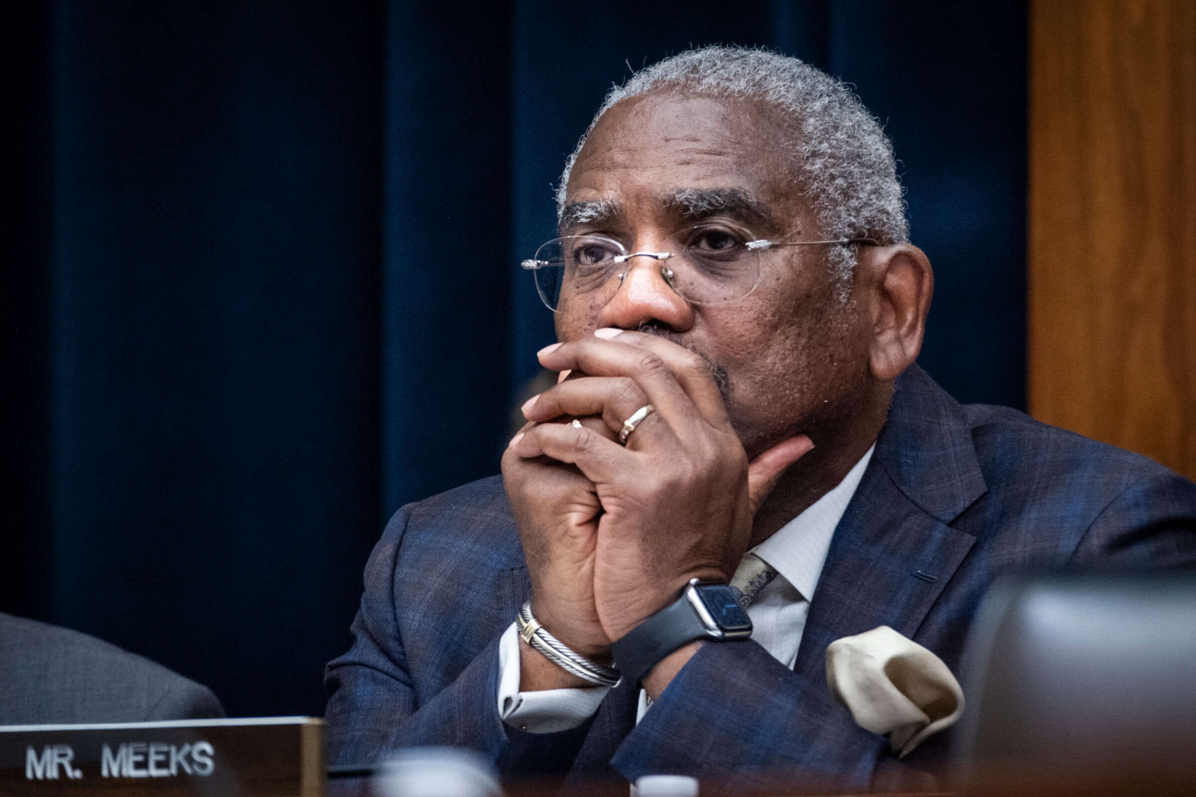 Rep. Gregory Meeks (D-N.Y.) listens to testimony during a House Financial Services Committee on May 7, 2025, on Capitol Hill. Photo by Pete Marovich / Getty Images