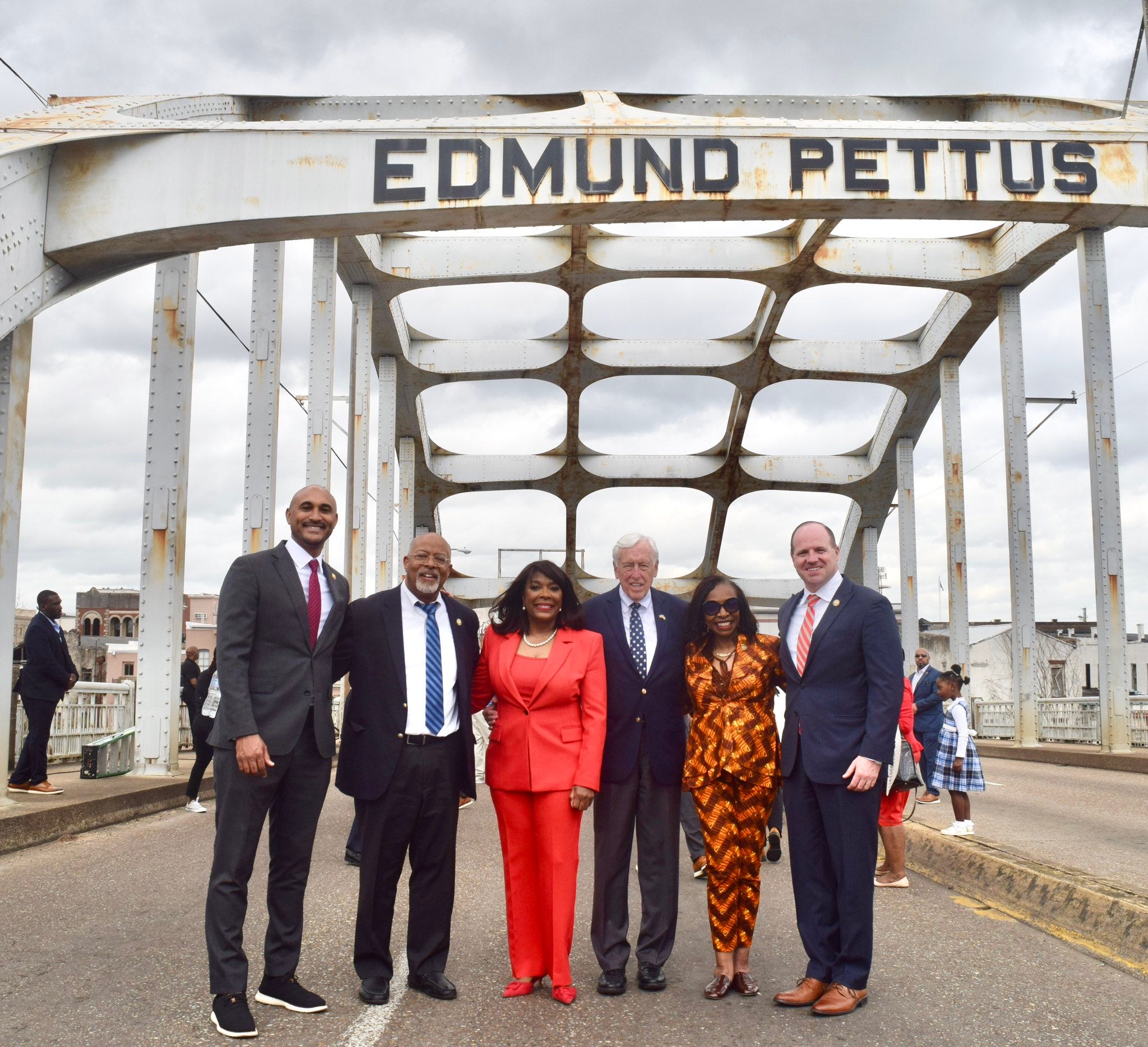 Rep. Shomari Figures (D-Ala.), Rep. Glenn Ivey (D-Md.), Rep. Terri Sewell (D-Ala.), Rep. Steny Hoyer (D-Md.), Congressional Black Caucus Chair Yvette Clarke (D-N.Y.) and Tim Kennedy (D-N.Y.) at the Edmund Pettus Bridge on March 7, 2026. Photo via X/@RepTerriSewell
